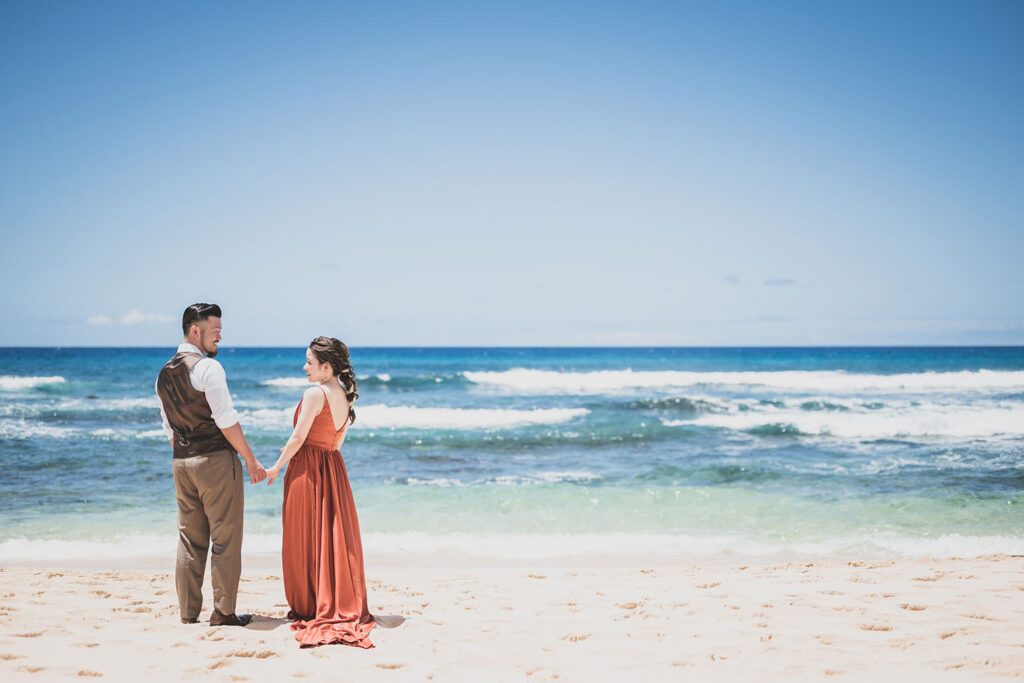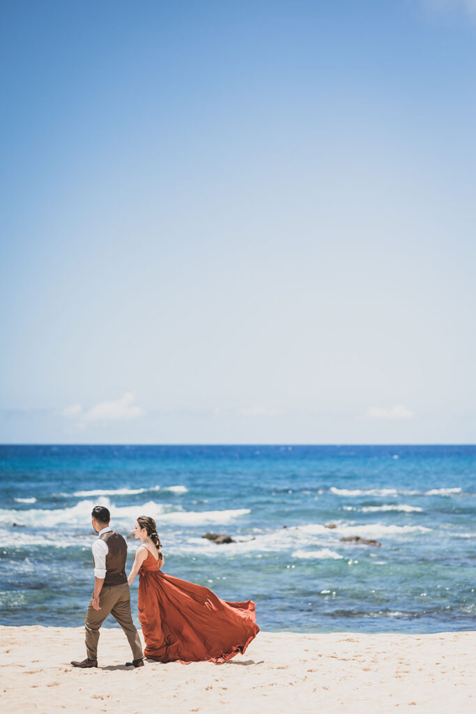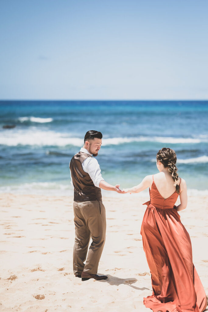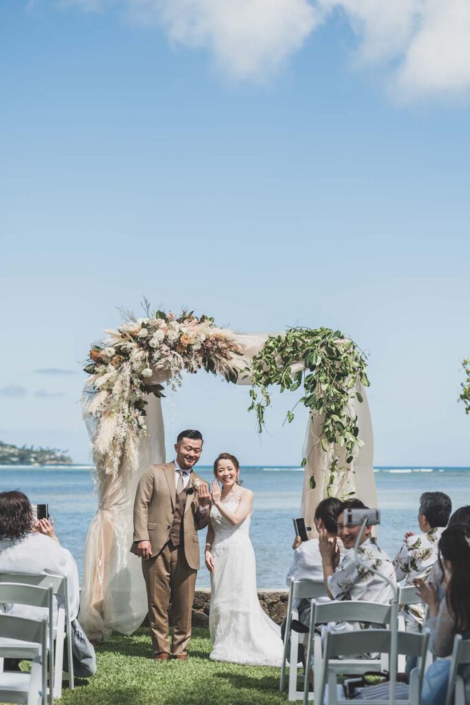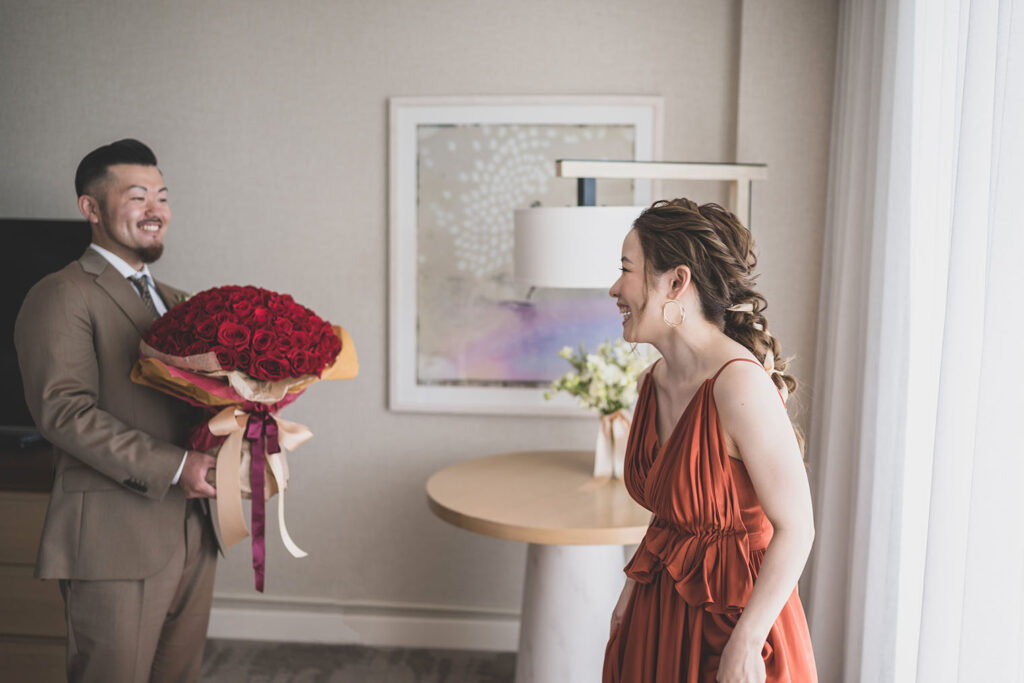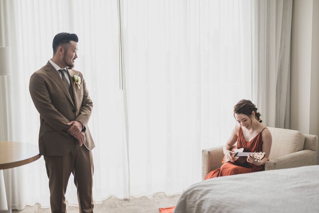 ハワイの結婚式に家族みんなに列席してもらうのが夢だったおふたり。いろんな情勢を見ながら待つこと2年…いよいよその夢が叶う日です。その日まで彼にこっそりウクレレを練習した彼女、そして毎年記念日に送っているバラを99本の花束にしてこっそり用意。お互いへのサプライズから大切な日がスタートしました。