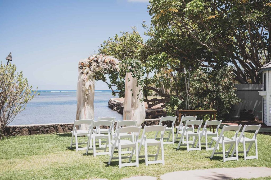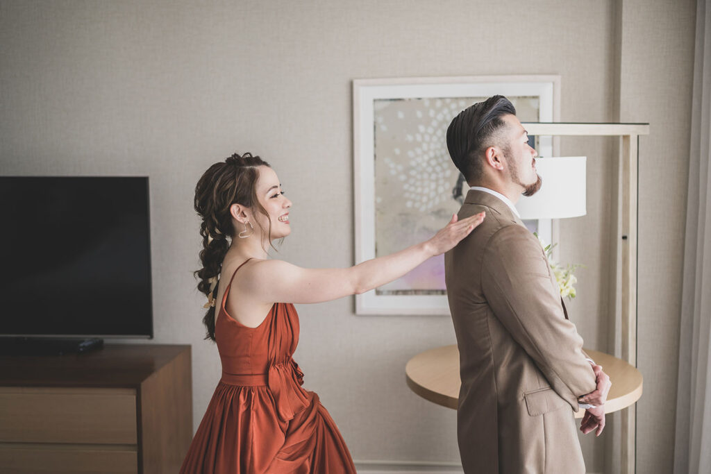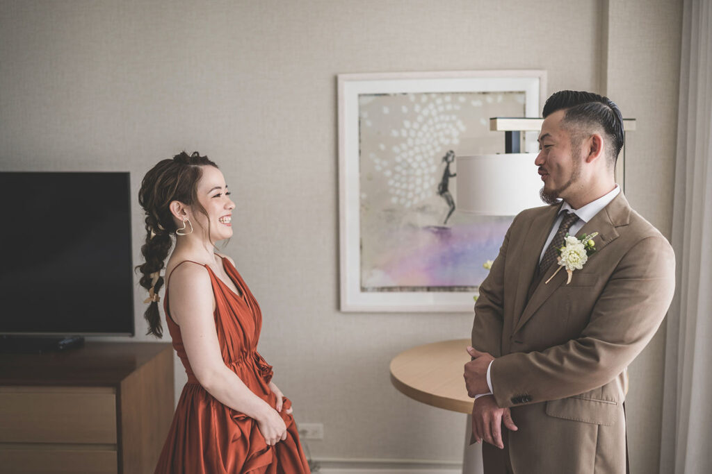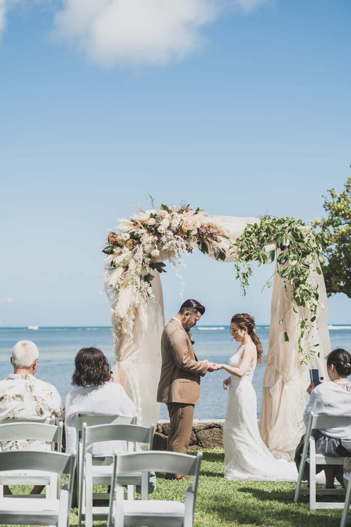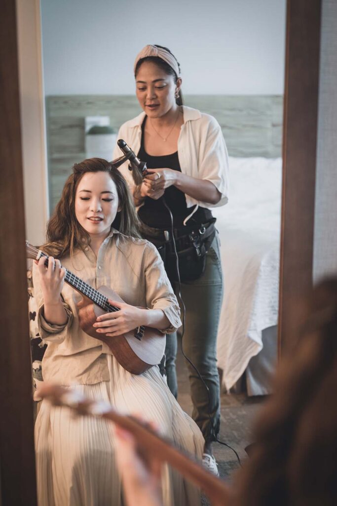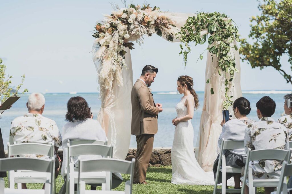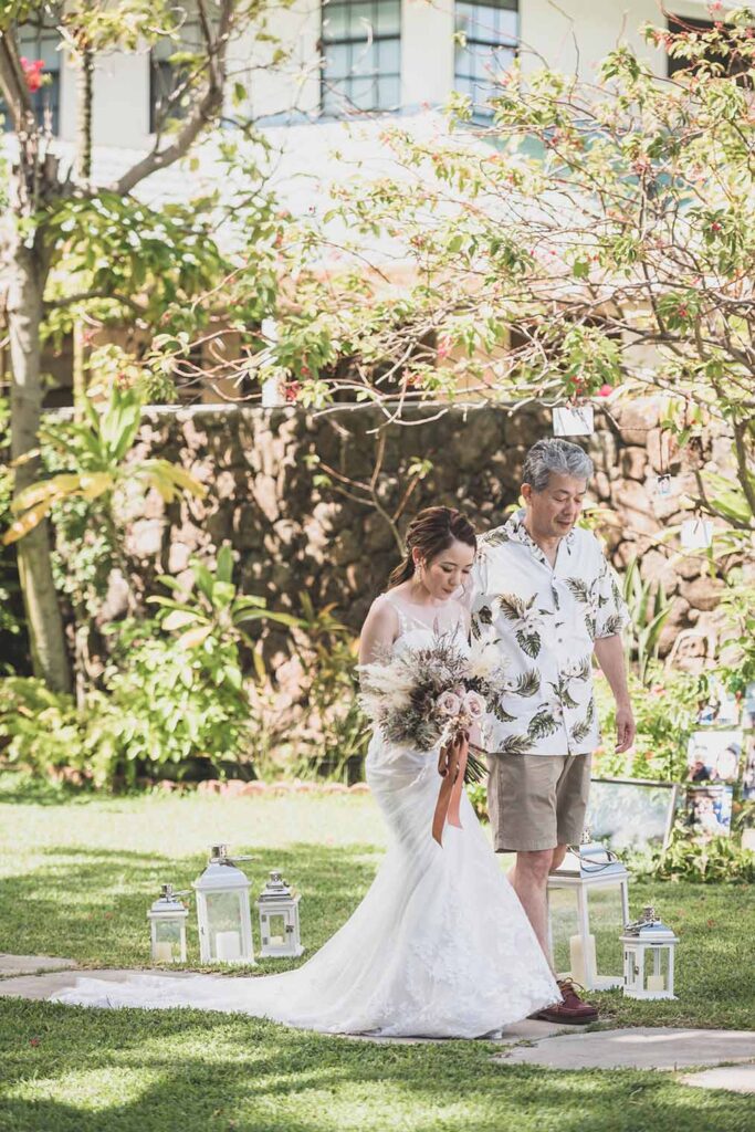 ハワイの結婚式に家族みんなに列席してもらうのが夢だったおふたり。いろんな情勢を見ながら待つこと2年…いよいよその夢が叶う日です。その日まで彼にこっそりウクレレを練習した彼女、そして毎年記念日に送っているバラを99本の花束にしてこっそり用意。お互いへのサプライズから大切な日がスタートしました。