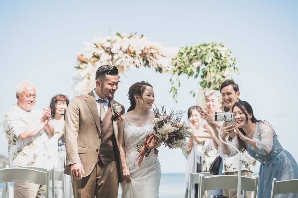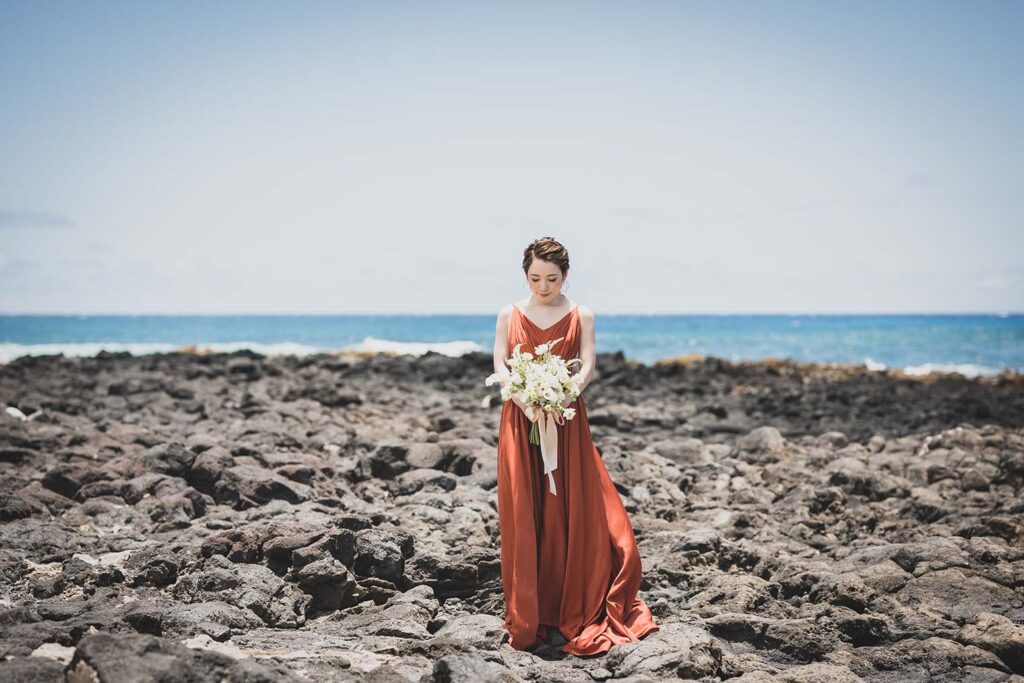 テラコッタドレスを身にまとい、まずはゴツゴツの溶岩がかっこいいビーチへ。挙式会場はお気に入りの「ツリーハウス」。デコレーションデザイナーと直接の打ち合わせも行い、こだわりいっぱいの会場での大切なご家族に見守られながらの人前式です。おふたりは少し照れくさそうに皆さんに向けて誓いの言葉を述べられました。新婦のお父様の表情からいろんな想いが溢れます。皆さん笑顔で心温まる素敵なお式となりました。
