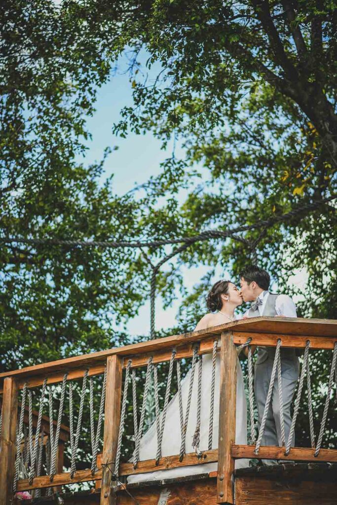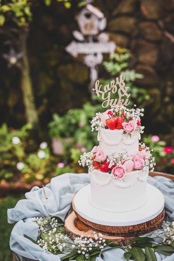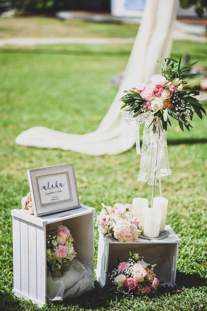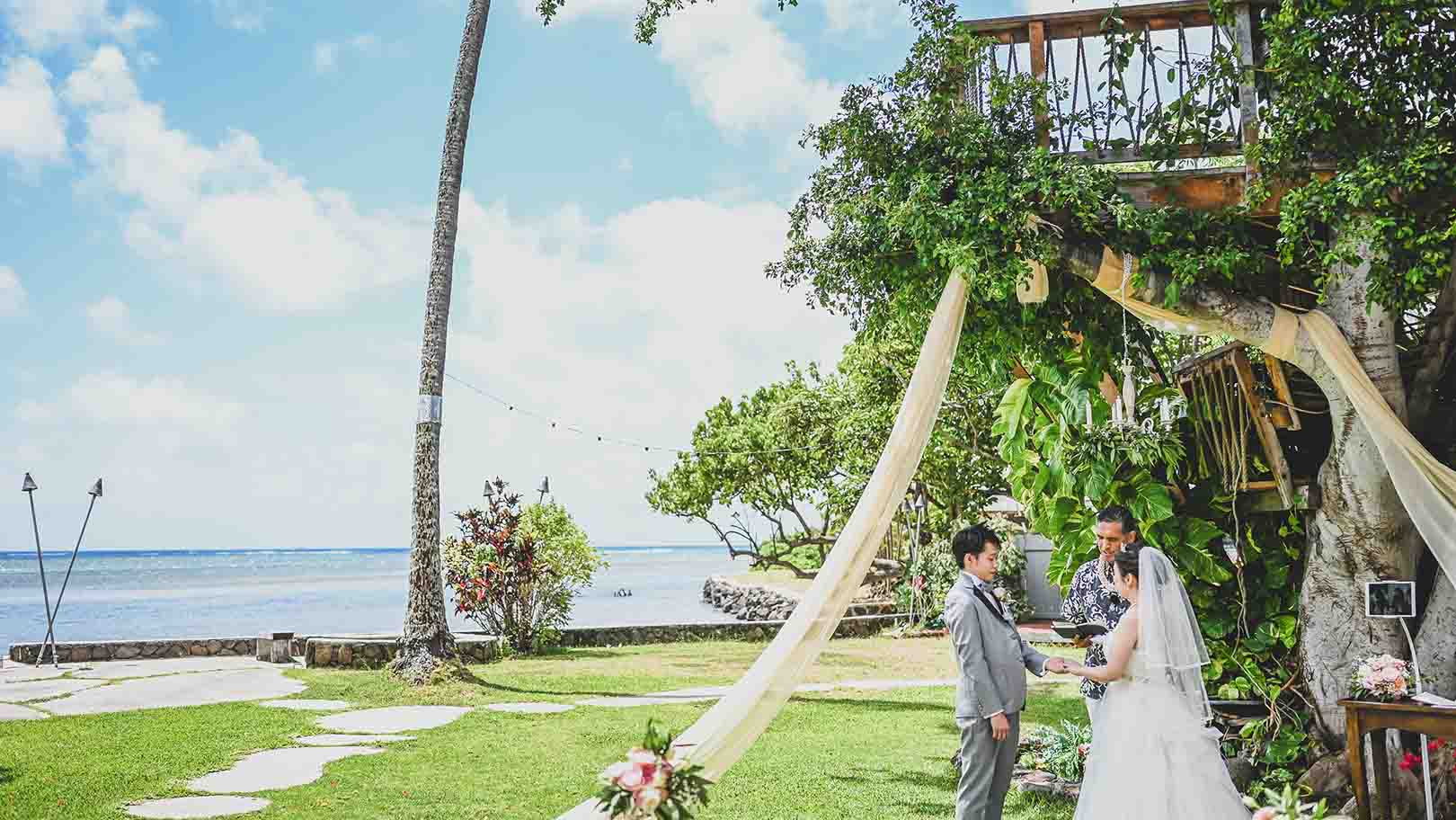 ふたりが大切な場所に選んだ会場は「ツリーハウス」。オーシャンフロントの邸宅のガーデンを使った挙式です。ガーデンの真ん中シンボルツリーの下で愛を誓い合います。かわいい雰囲気がお好きな花嫁のお好みに合わせて、ピンク&ホワイトのお花をたくさん使った舞台に仕上げました。